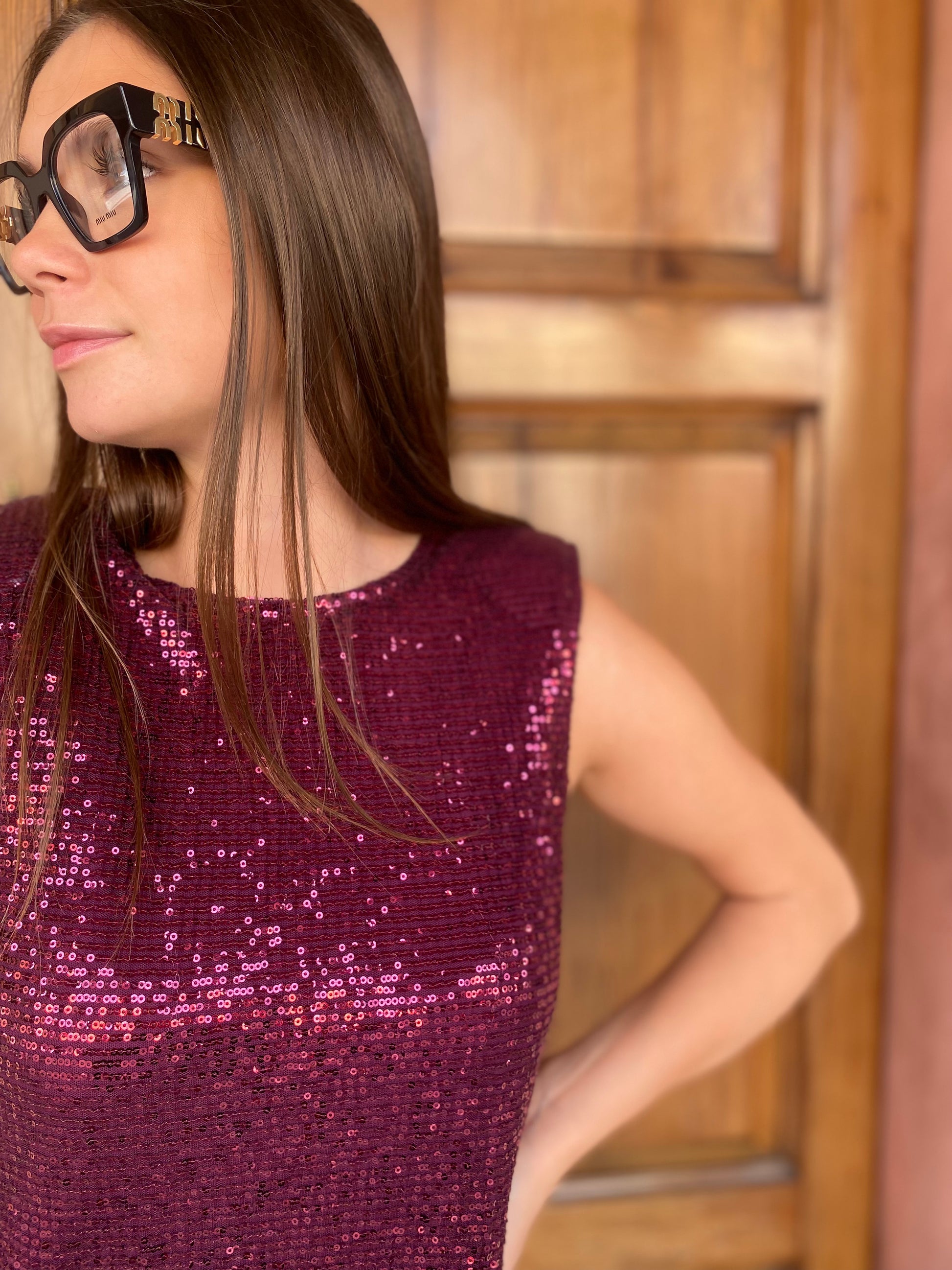Mini abito Borgogna realizzato in tessuto ricamato in paillettes, linea leggermente svasata, con fodera