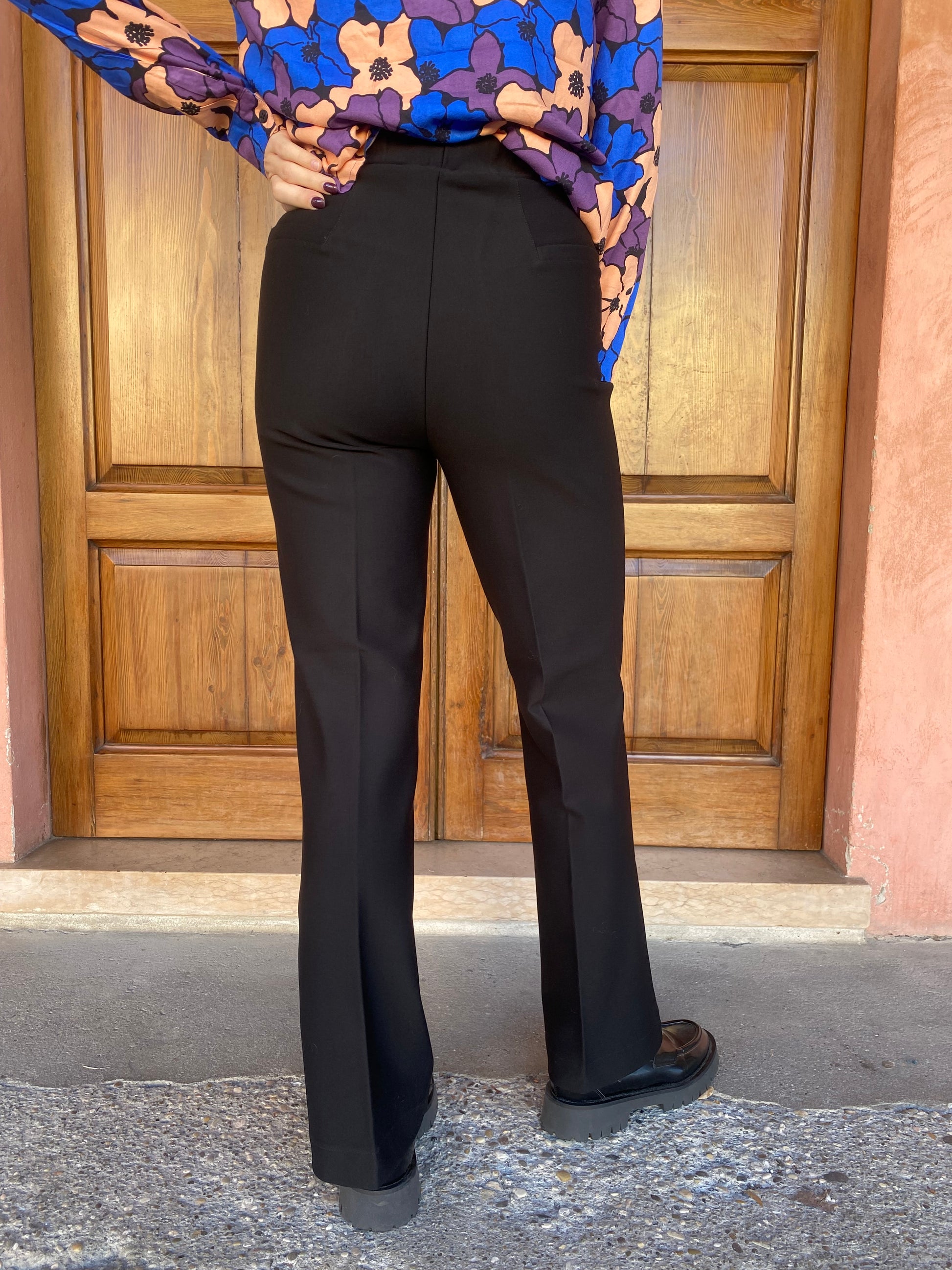 Con uno stile scampanato a zampa, questo pantalone è la scelta perfetta per un look raffinato e originale. La vita elasticizzata segue delicatamente le forme, garantendo una vestibilità impeccabile.