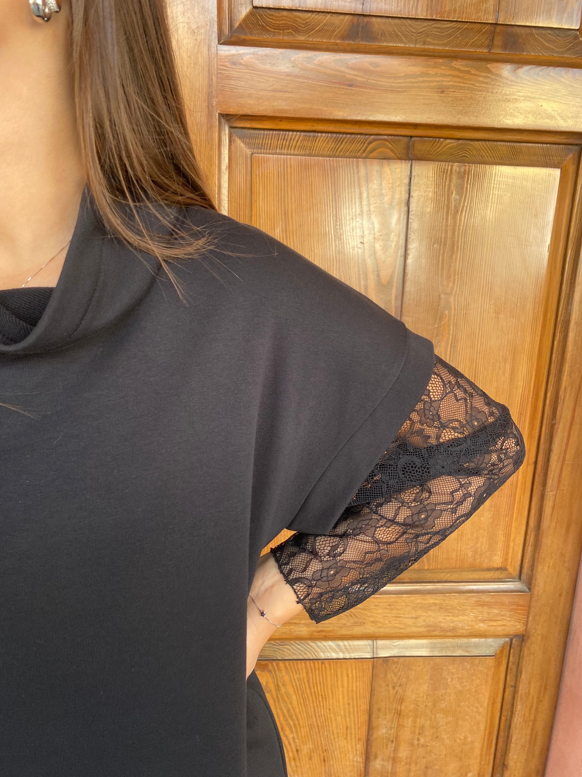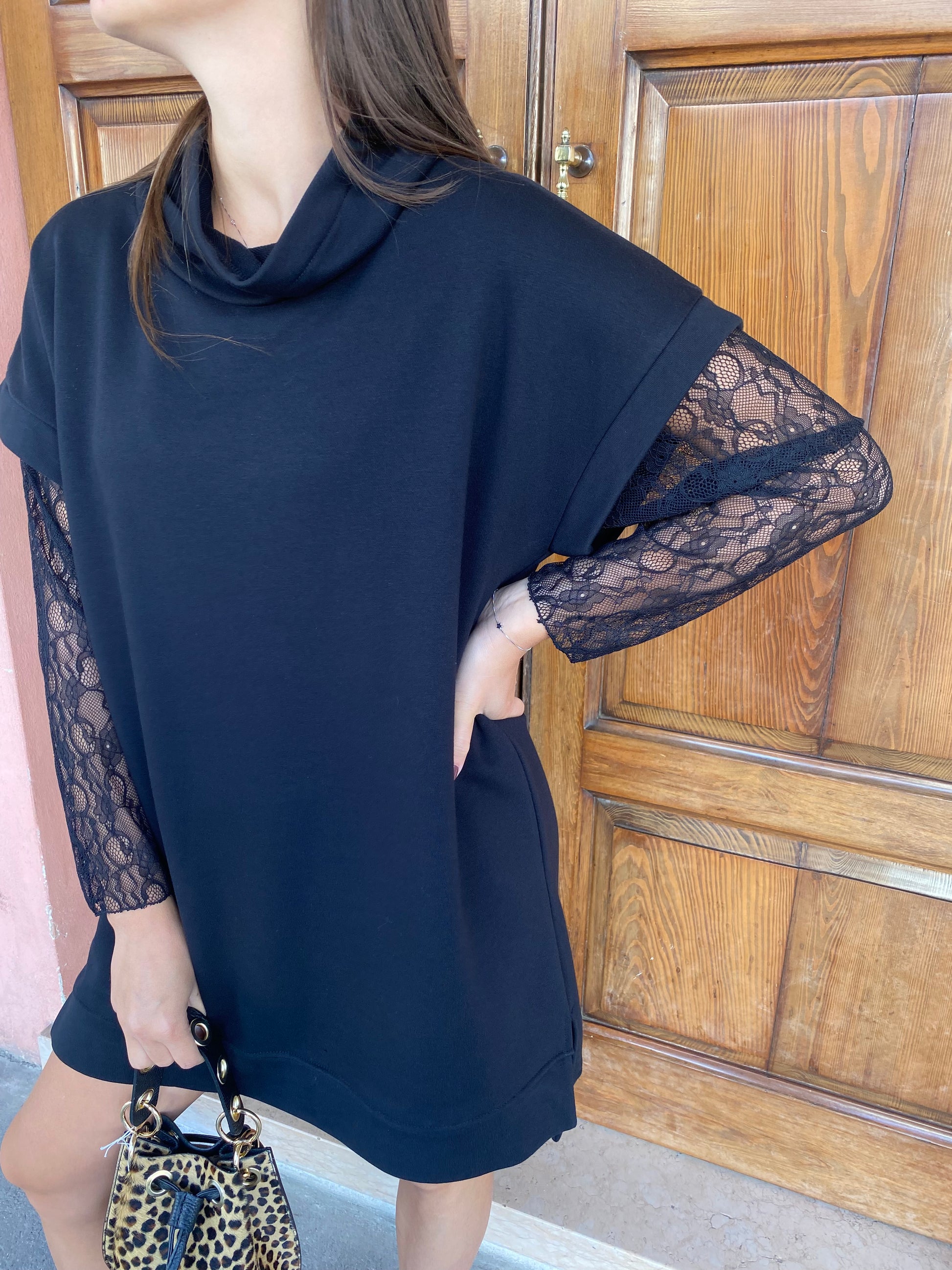 Mini abito\maxi felpa con collo a ciambella e maniche in pizzo.