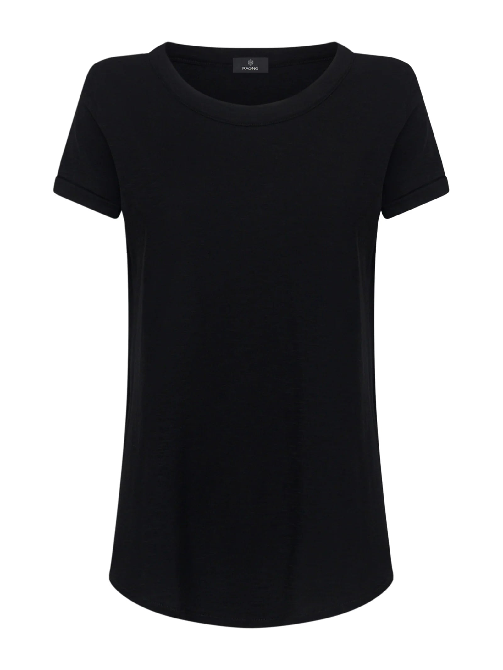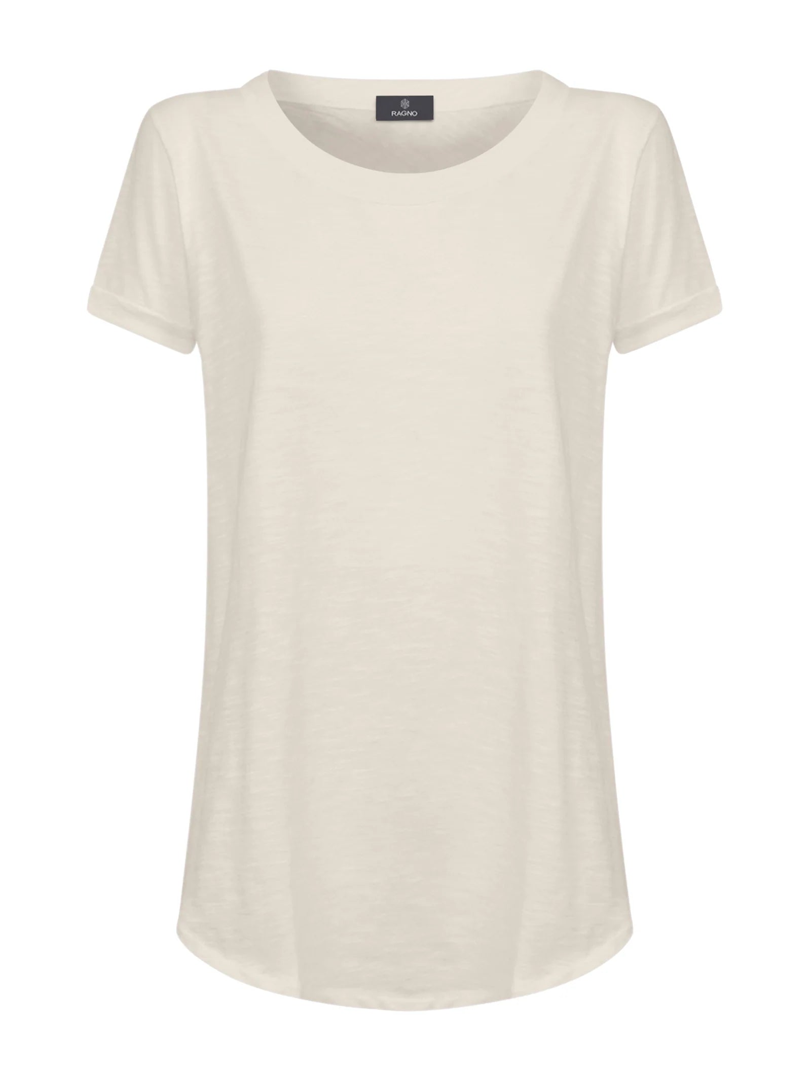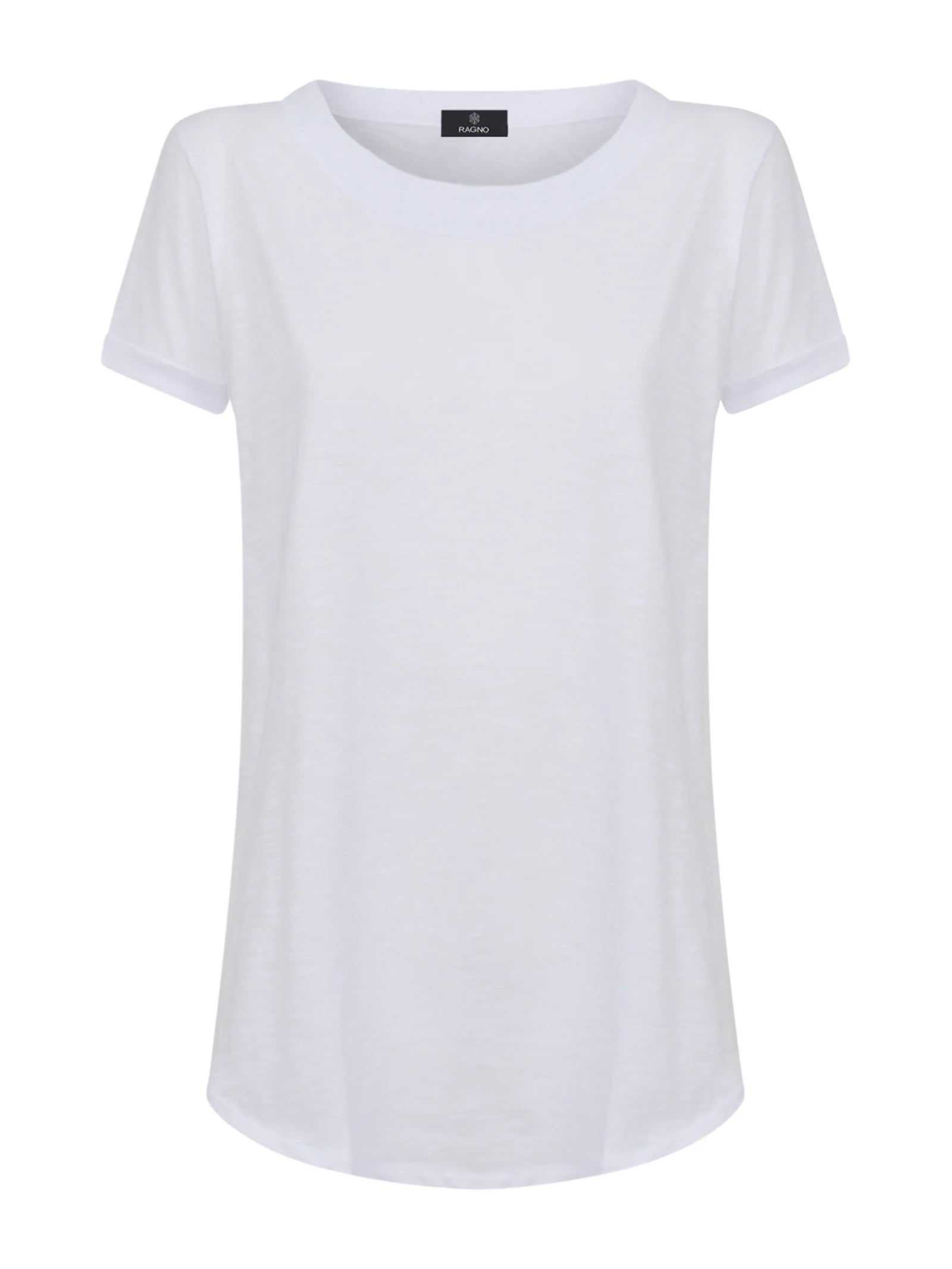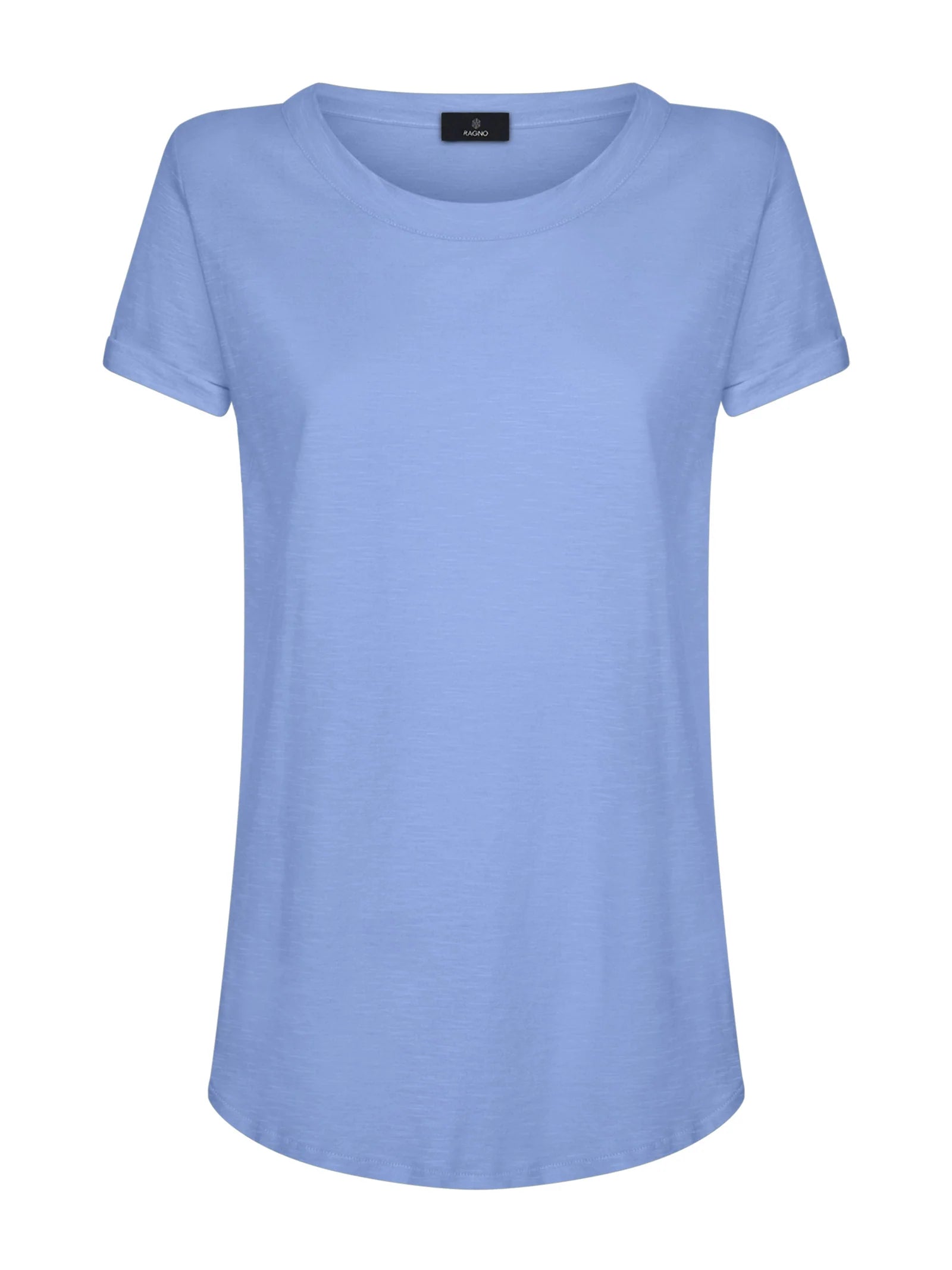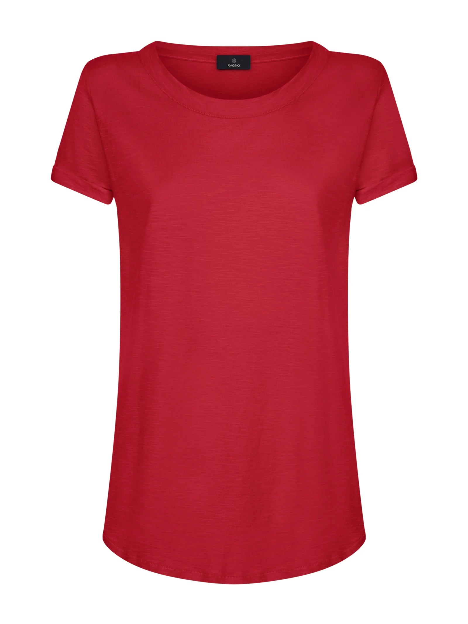 T-shirt girocollo da donna con la manica corta e il fondo svasato.