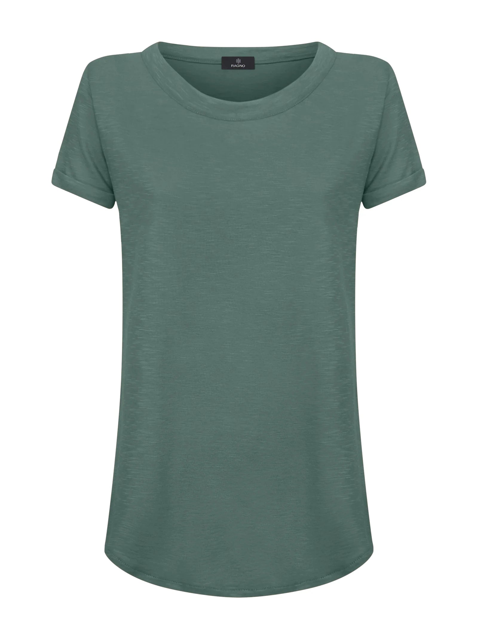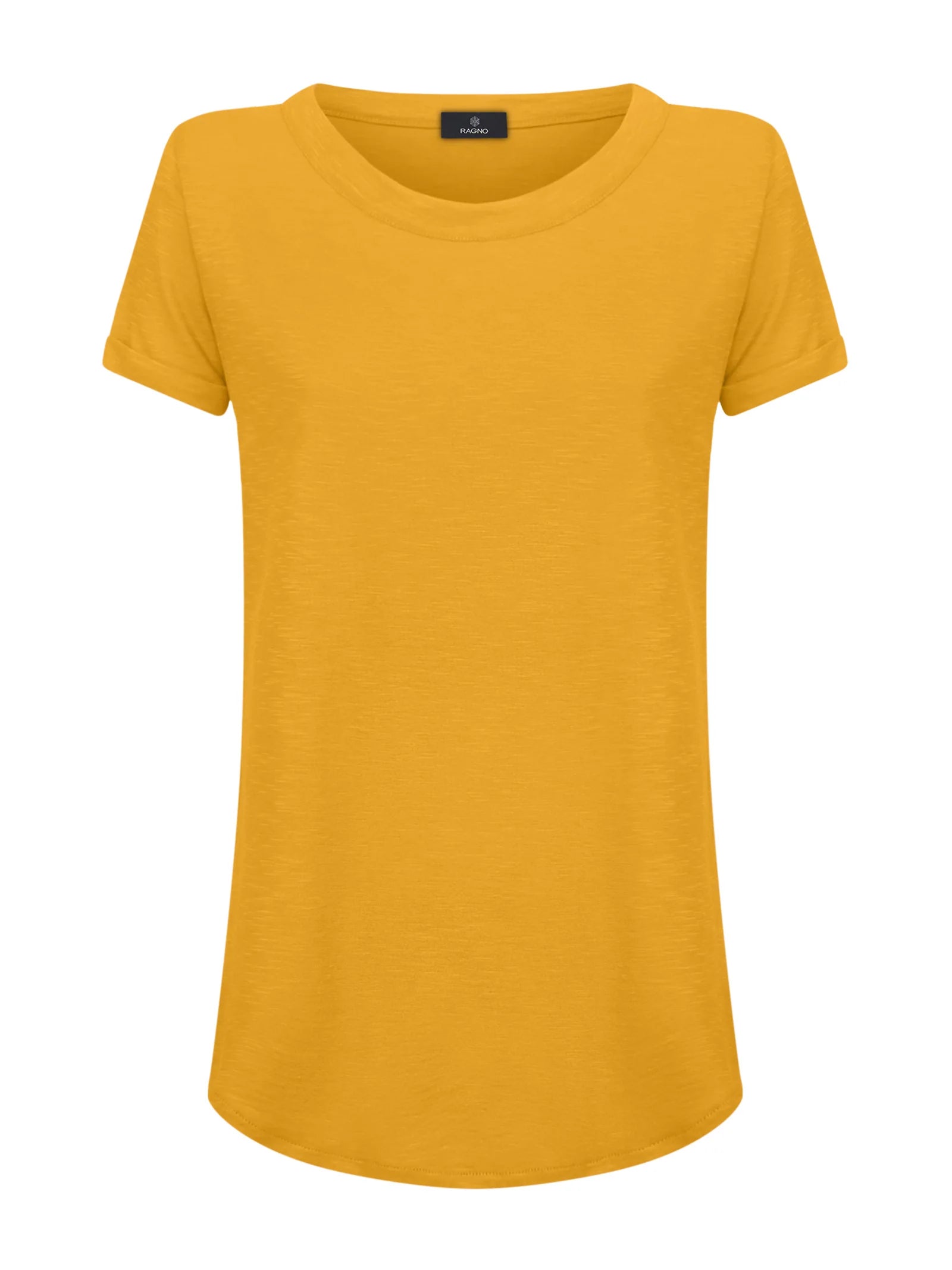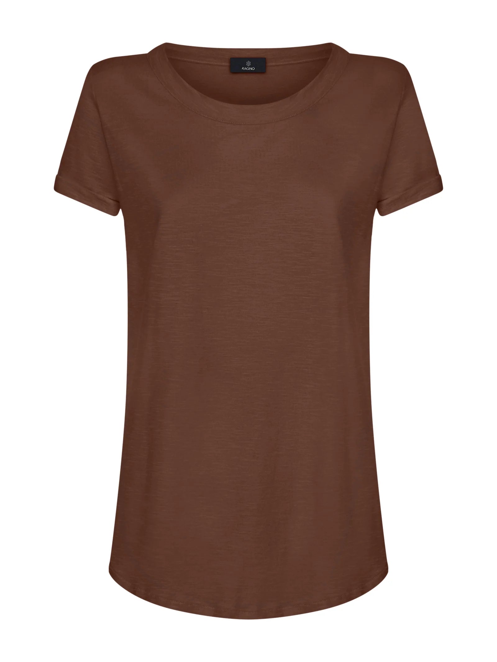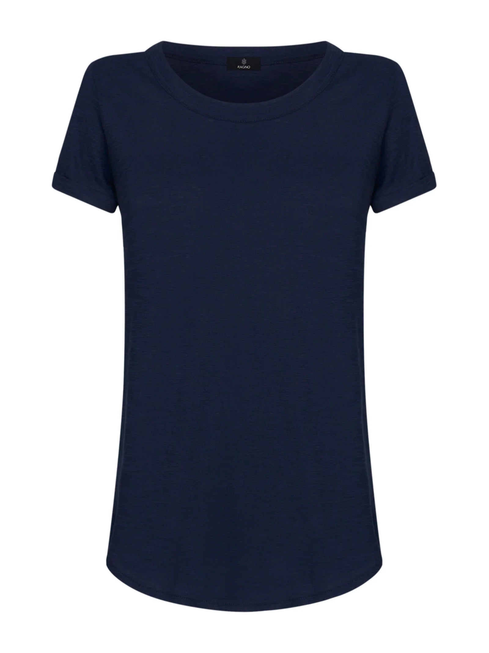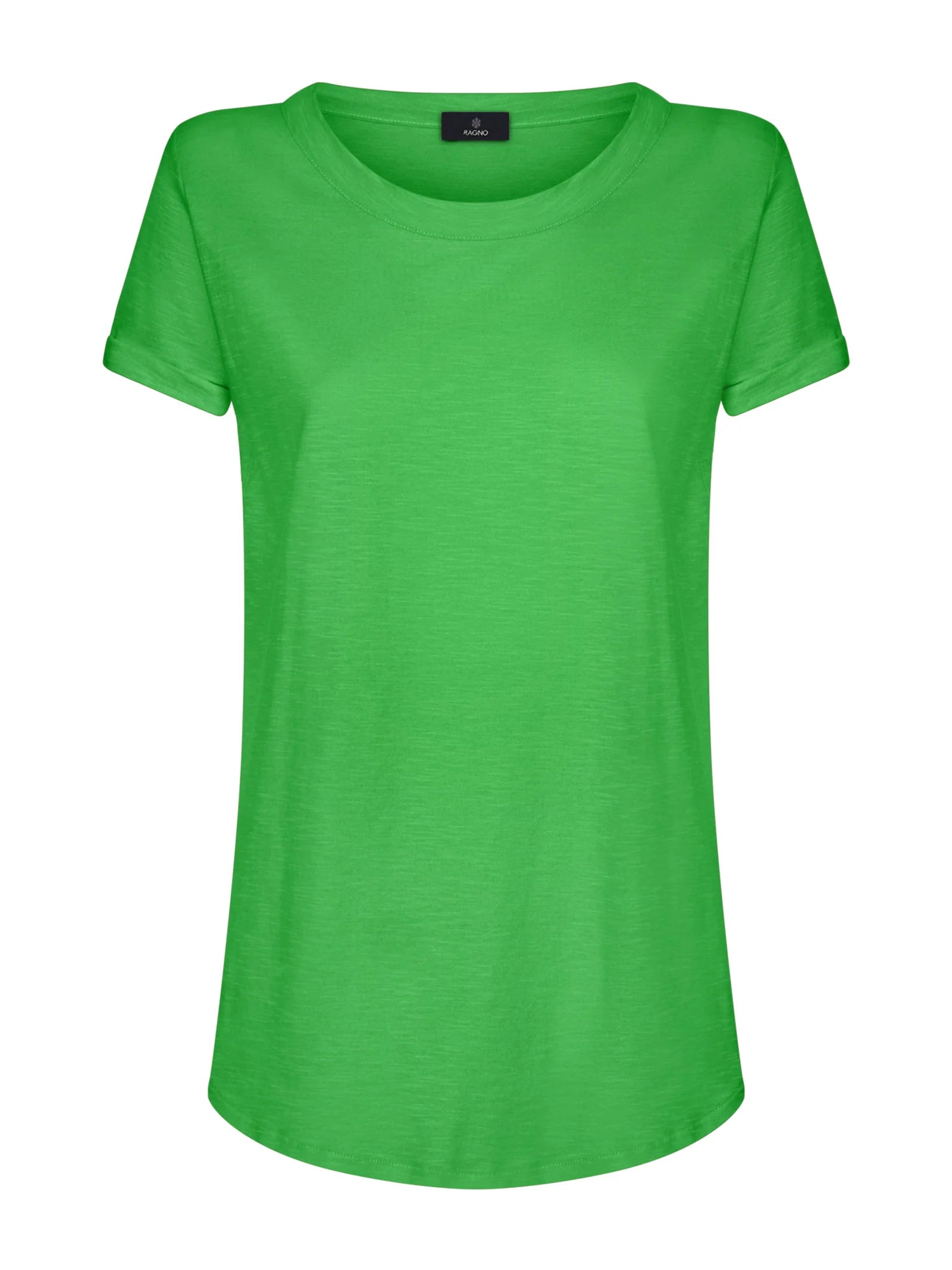 T-shirt girocollo da donna con la manica corta e il fondo svasato.
